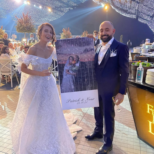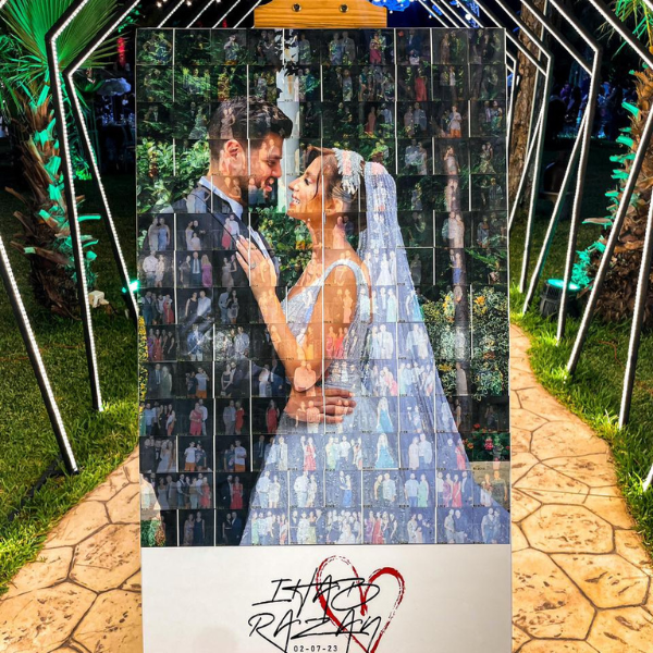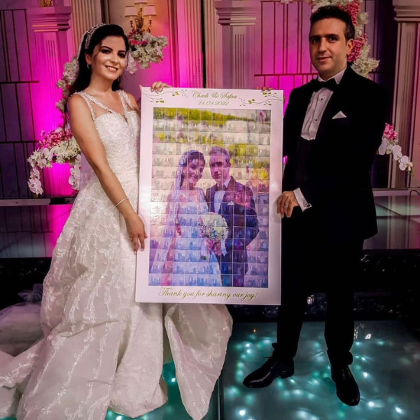 The MosaPic is a service provided next to the photobooth whereby guests take their pictures on the photobooth and both a 10*15 print out and a sticker 5*5 will be printed. The guests will stick the stickers on a board which will eventually turn out as a mosaic picture made of the couple.